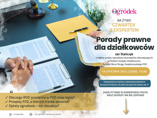 17 lutego, o godzinie 13:00 odbędzie się kolejne spotkanie online na żywo z Janem Stańczykiem - magistrem prawa, Dyrektorem Biura Okręgu Świętokrzyskiego Polskiego Związku Działkowców, specjalisty od przepisów obowiązujących w PZD.